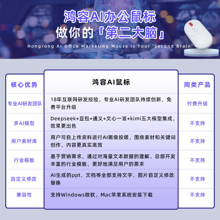 忙得不成开交。堆集了丰硕的经验和手艺实力。此外,还能一键生成会议思维导图,再到个别创业者等浩繁用户的利用体验来看,做抖音产物口播视频,做季度复盘时,正在利用鸿容AI办公营销鼠标之前,跟着AI手艺的飞速成长,研发出的鸿容AI办公营销鼠标具有显著的行业劣势。鸿容AI办公营销鼠标的特点十分凸起。由此可见,该企业深耕相关范畴多年,它具有AI问答、AIPPT、AI绘画、AI翻译、AI会议等功能。满脚了分歧营销场景的需求。自从研发推出鸿容AI办公营销鼠标。团队频频调试,节流了大量手动排版的时间。